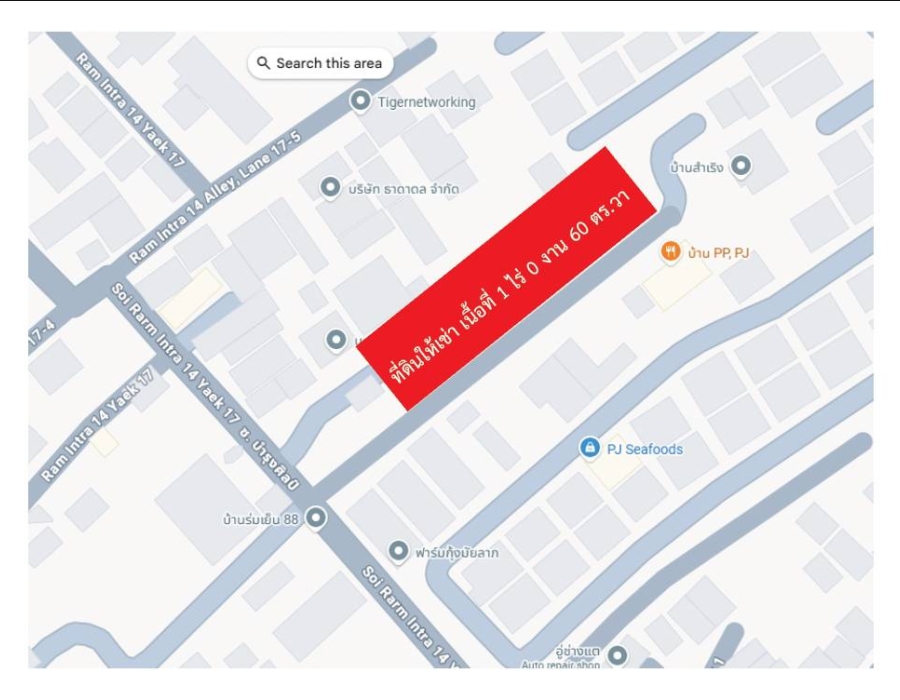 ต้องการให้เช่าที่ดินเปล่าถมแล้วราคาถูก มีเนื้อที่ให้เช่า 1 ไร่ 0 งาน 60 ตารางวา หรือ 460 ตารางวา ที่ดินที่ให้เช่าเข้าทางถนนรามอินทราซอย 14 ประมาณ 1 ก.ม. เลี้ยวซ้ายเข้าซอยรามอินทราซอย 14 แยก 17 ประมาณ 300 เมตร ถ้าเข้าทางถนนเกษตรตัดใหม่ หรือ ถนนประเสริฐมนูกิจซอย 29 ข้ามสะพานข้ามคลองโคกคราม ซอยรามอินทรา 14 แยก 17 อยู่ทางด้านขวามือ ถนนรามอินทรา 14 แยก 17 เป็นเส้นทางลัดไปออกถนนรามอินทราซอย 34 และ ขึ้นทางด่วนเอกมัย-รามอินทราได้ ที่ดินที่ให้เช่าเป็นรูปสี่เหลี่ยมผื้นผ้ากว้างประมาณ 80 เมตร ลึกประมาณ 24 เมตร ที่ดินที่ให้เช่าล้อมรั้วคอนกรีตไว้ทั้งหมดแล้ว ให้เช่าทั้งหมดในราคา 30,000 บาท/เดือน