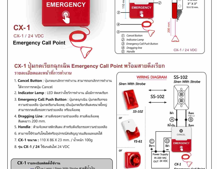 ปุ่มกดฉุกเฉินในห้องน้ำคนพิการ Emergency Call Point พร้อมสายดึงเรียก มีปุ่มกดสำหรับกดเรียกและสายดึงเรียก และสามารถยกเลิกได้โดยการกดปุ่มยกเลิกการทำงาน มีไฟบอกสถานะการทำงาน
